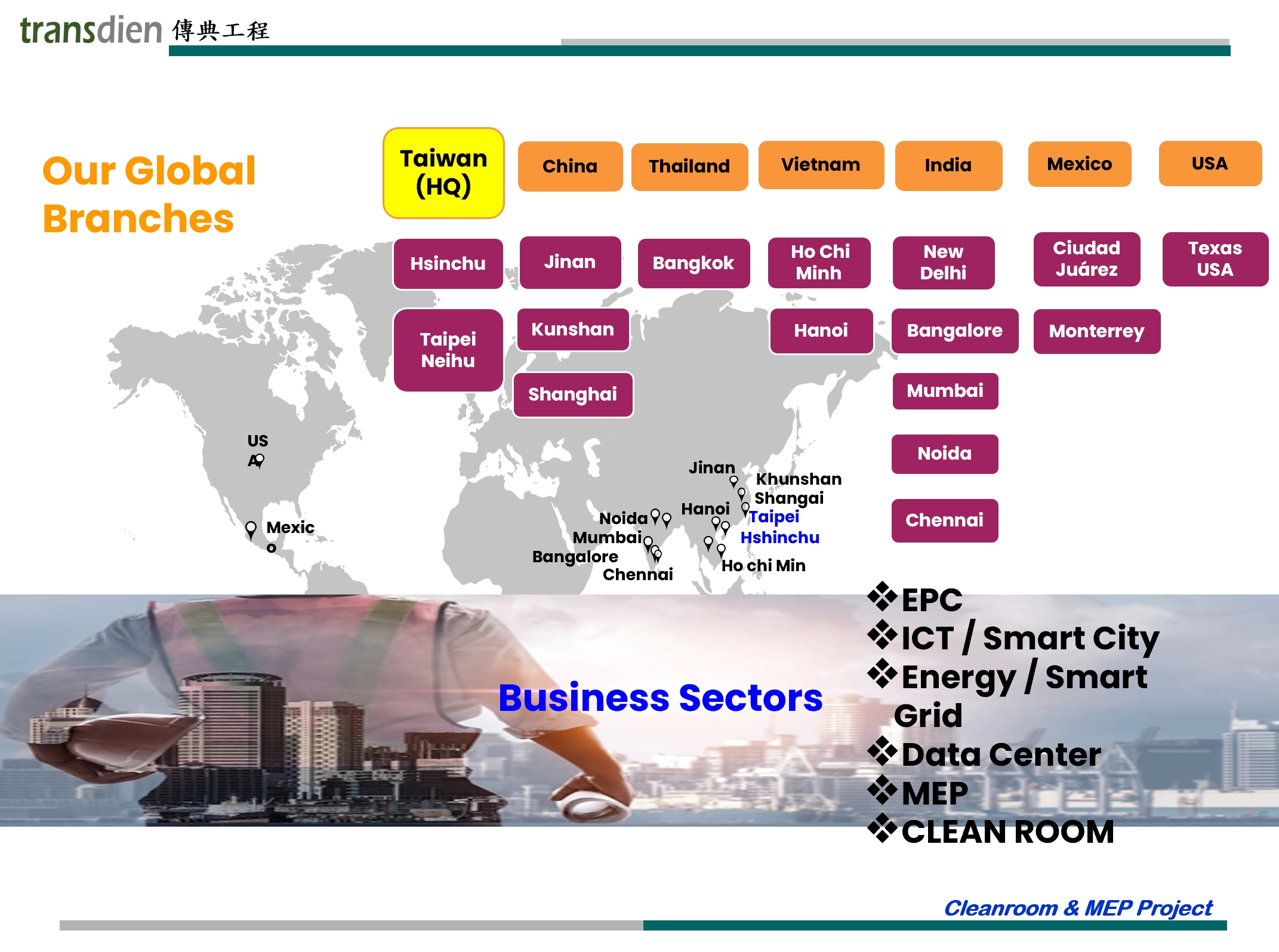 Founded in 2001,Transdien's main business is the construction of electromechanical and decoration projects in the fields of semiconductor, optoelectronics, computers, mobile phones, Netcom and other high-tech electronics industries, biotechnology and medicine, hospitals, fine chemicals, and food manufacturing. Provide comprehensive one-stop services, complete construction project management and project operation services. Including plant construction planning, design recommendations, equipment configuration, clean room engineering, environmental system engineering, engineering construction services, equipment and system commissioning, plant operation services and daily maintenance, etc. We will provide the highest standards for the projects delivered by customers, so that customers can trust and use them with confidence, and obtain the greatest satisfaction, continuous trust and support.
